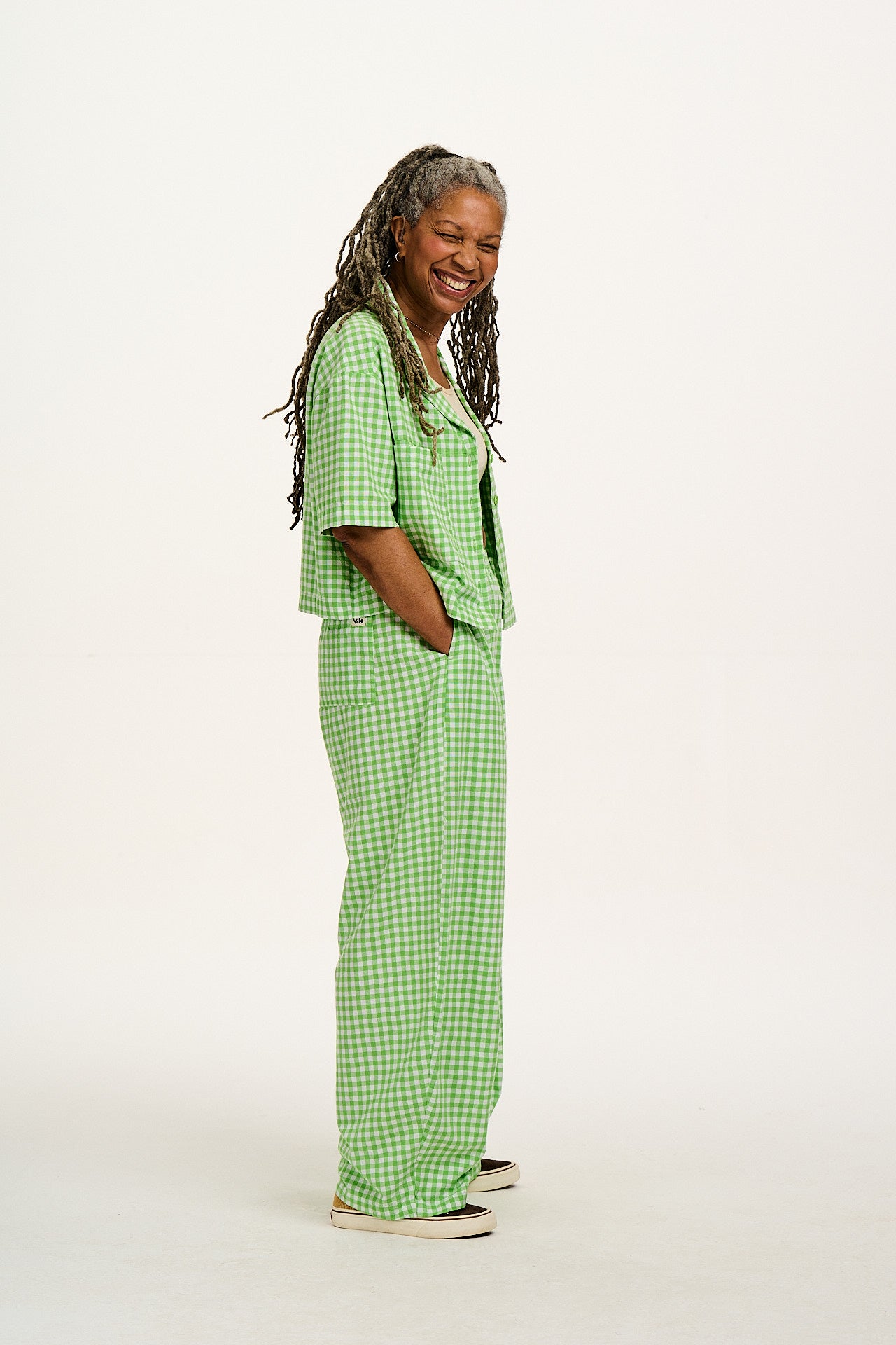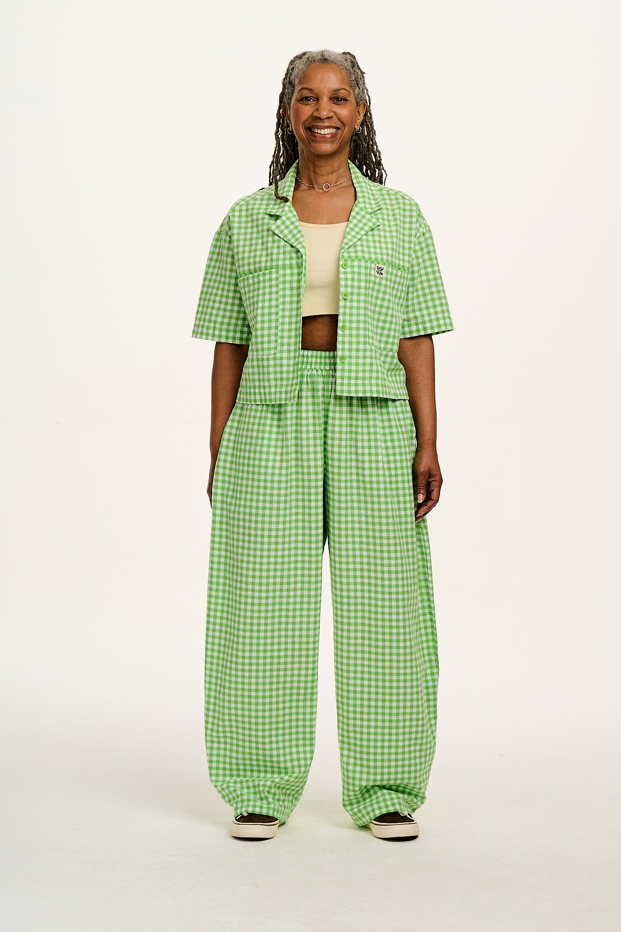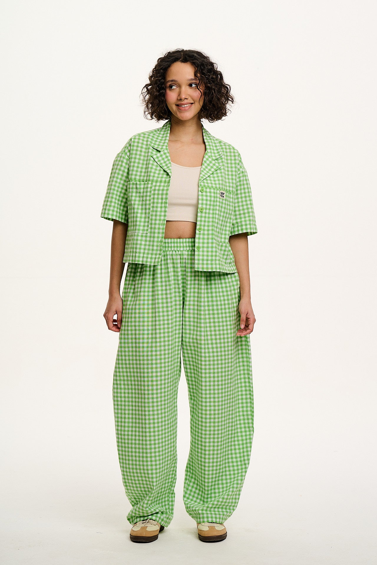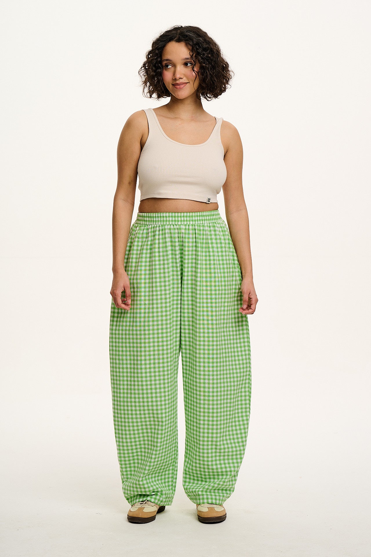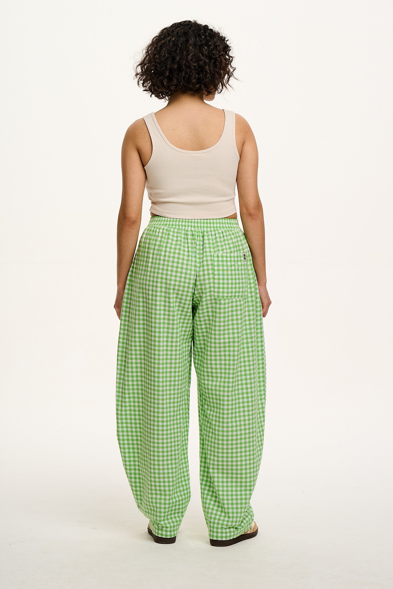 Freddie - Barrel Leg Cotton Trousers in Green Bonitto Gingham