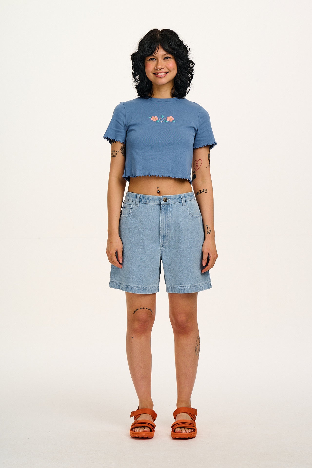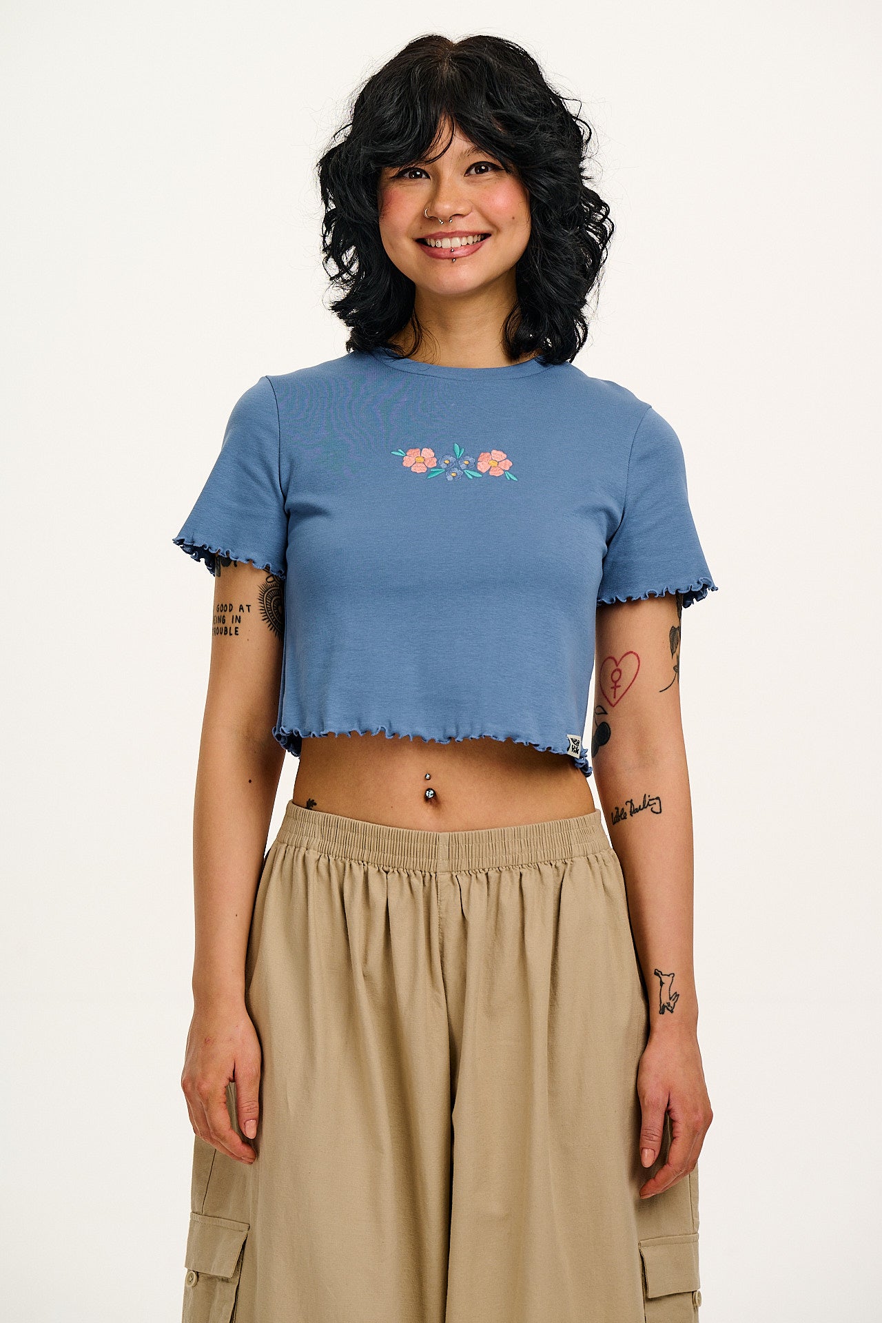 Greta - Cropped Cotton Top in Blue with Floral Embroidery