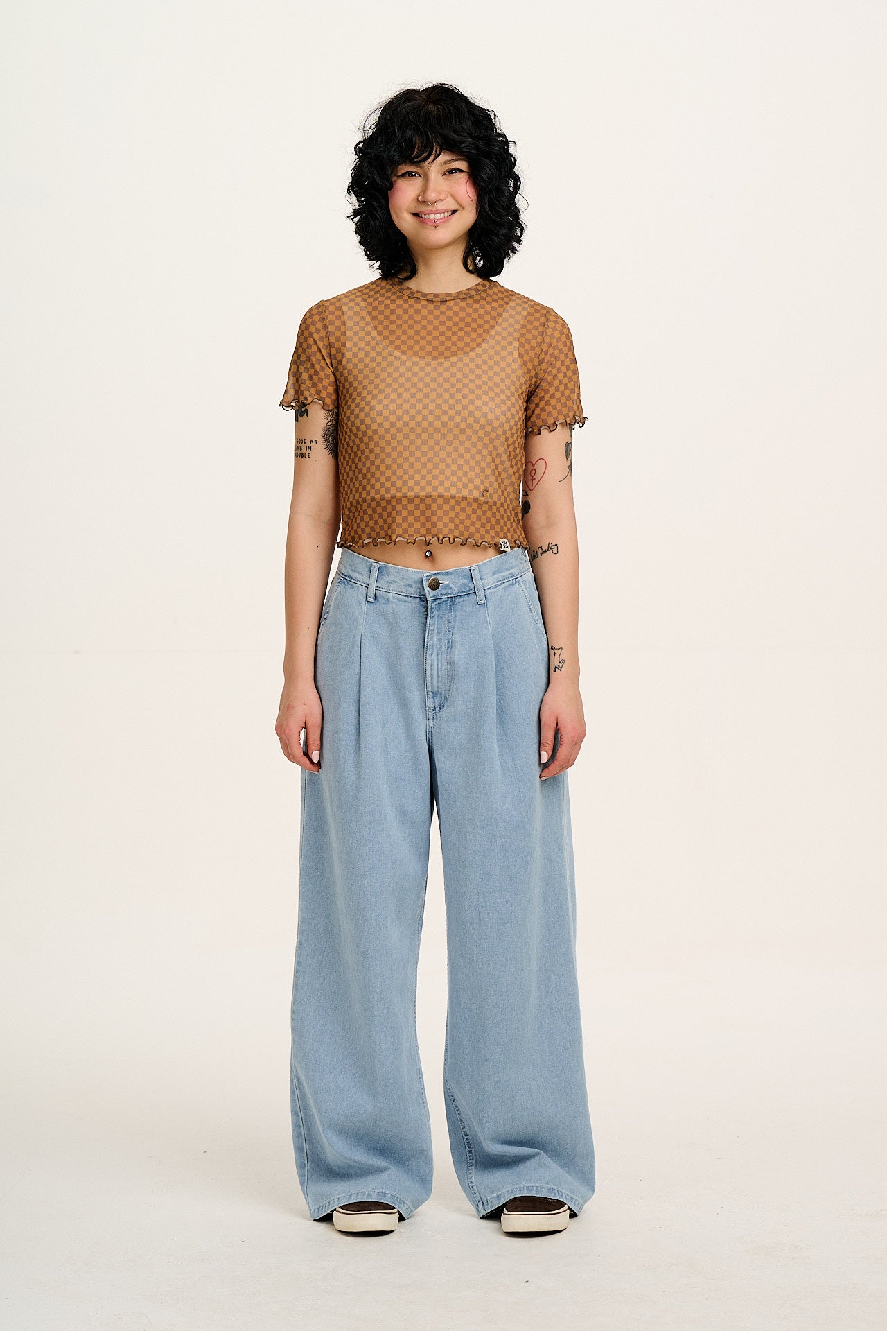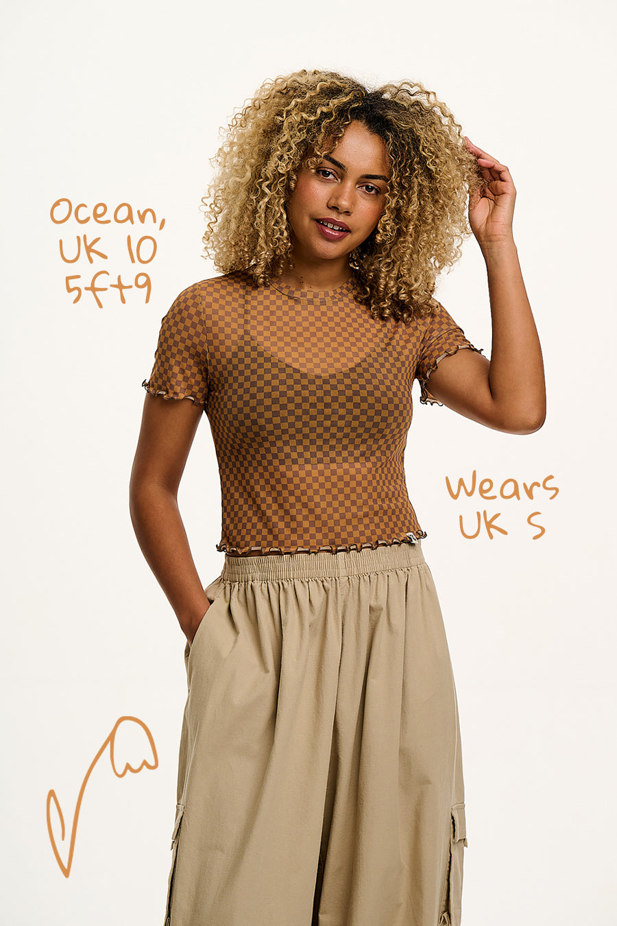 Greta - Cropped Mesh Top in Yellow & Brown Checkerboard